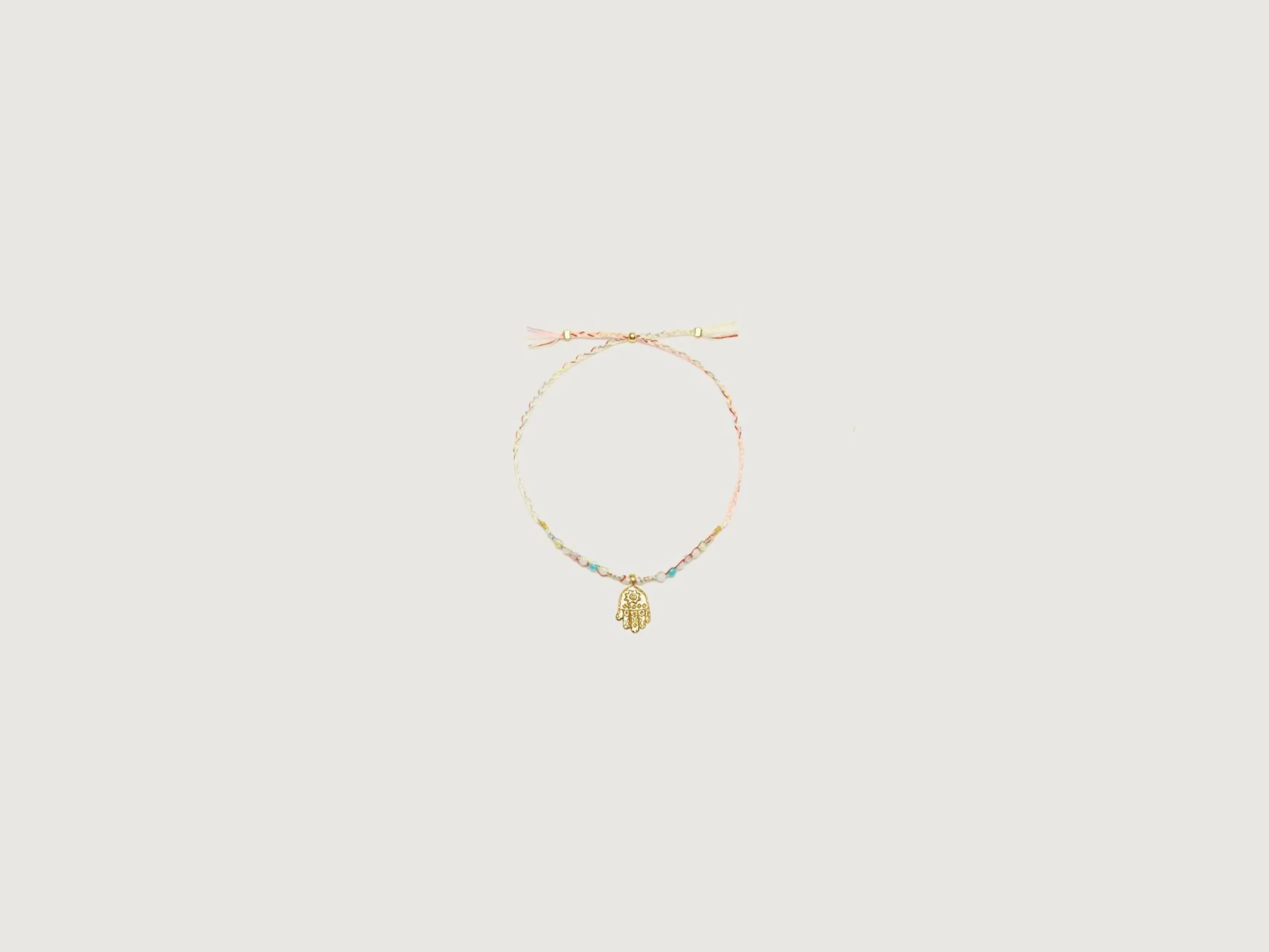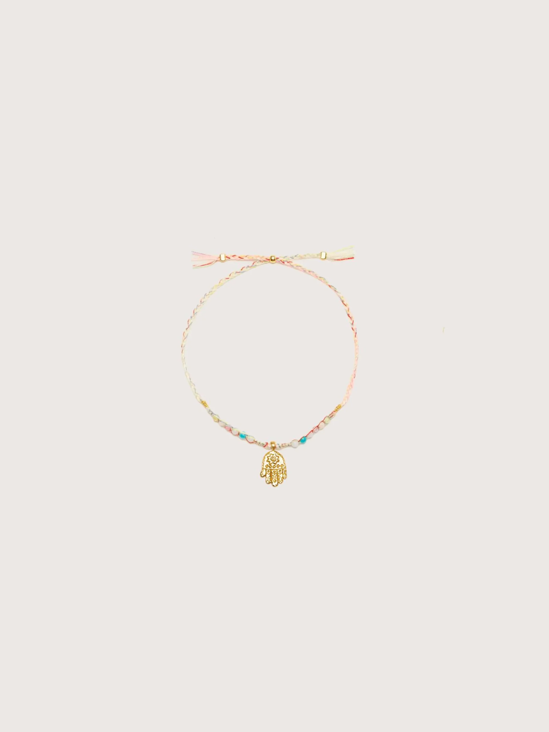 De Hamsa armband is een handgemaakte, verstelbare vlecht van fijn koord versierd met edelstenen en een vergulde bedel.