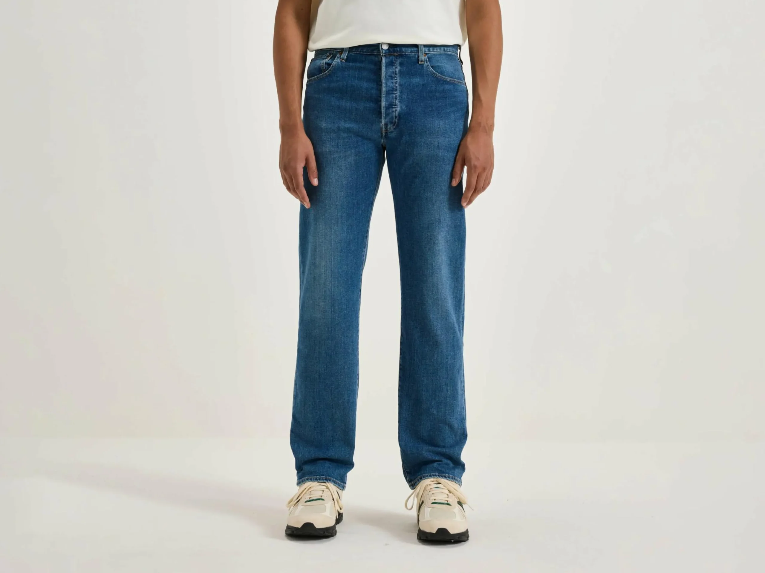 De Levis® 501™ Original denim jeans met geweldige stretch in Medium Indigo Stonewash Blue heeft een klassieke pasvorm met rechte pijpen.