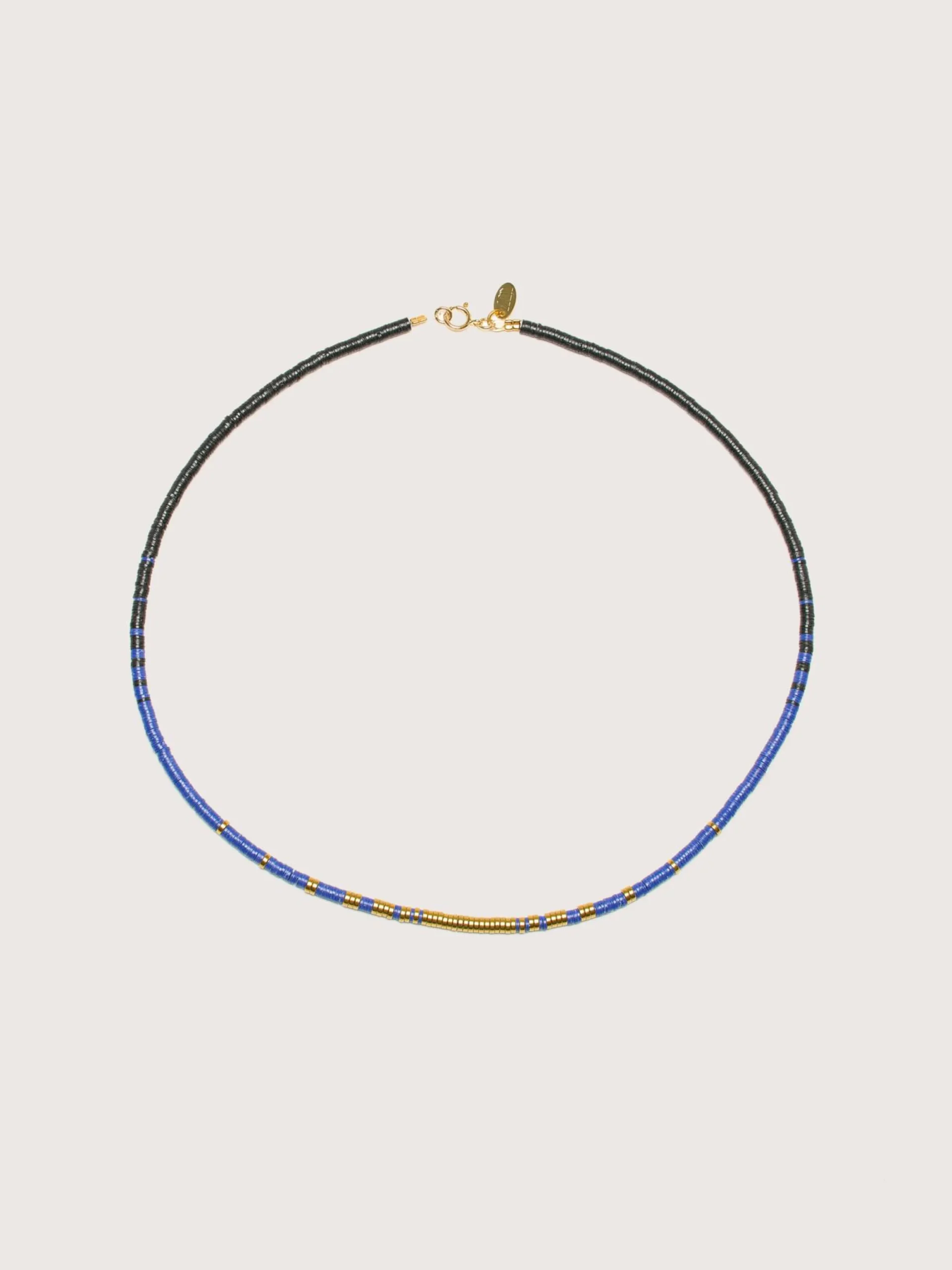 De Maison Mönik Indigo 3 handgemaakte ketting is gemaakt van gerecycled Ghanees vinyl en metallic hematietkralen.