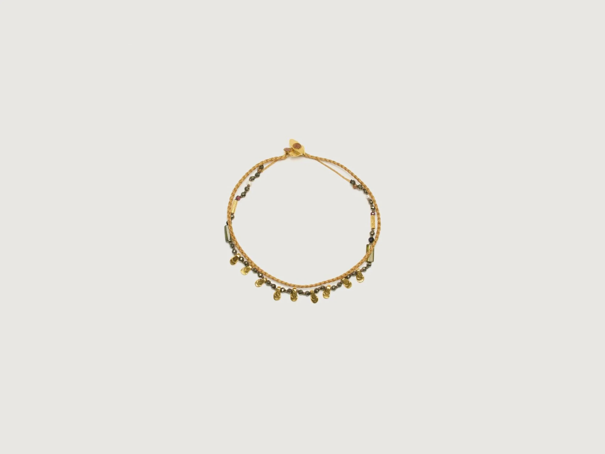 The Mary Gaitani Pyrite bracelet is handmade in Greece with pyrite stones, black glass beads, and 18k gold-plated charms on a waxed cord.
