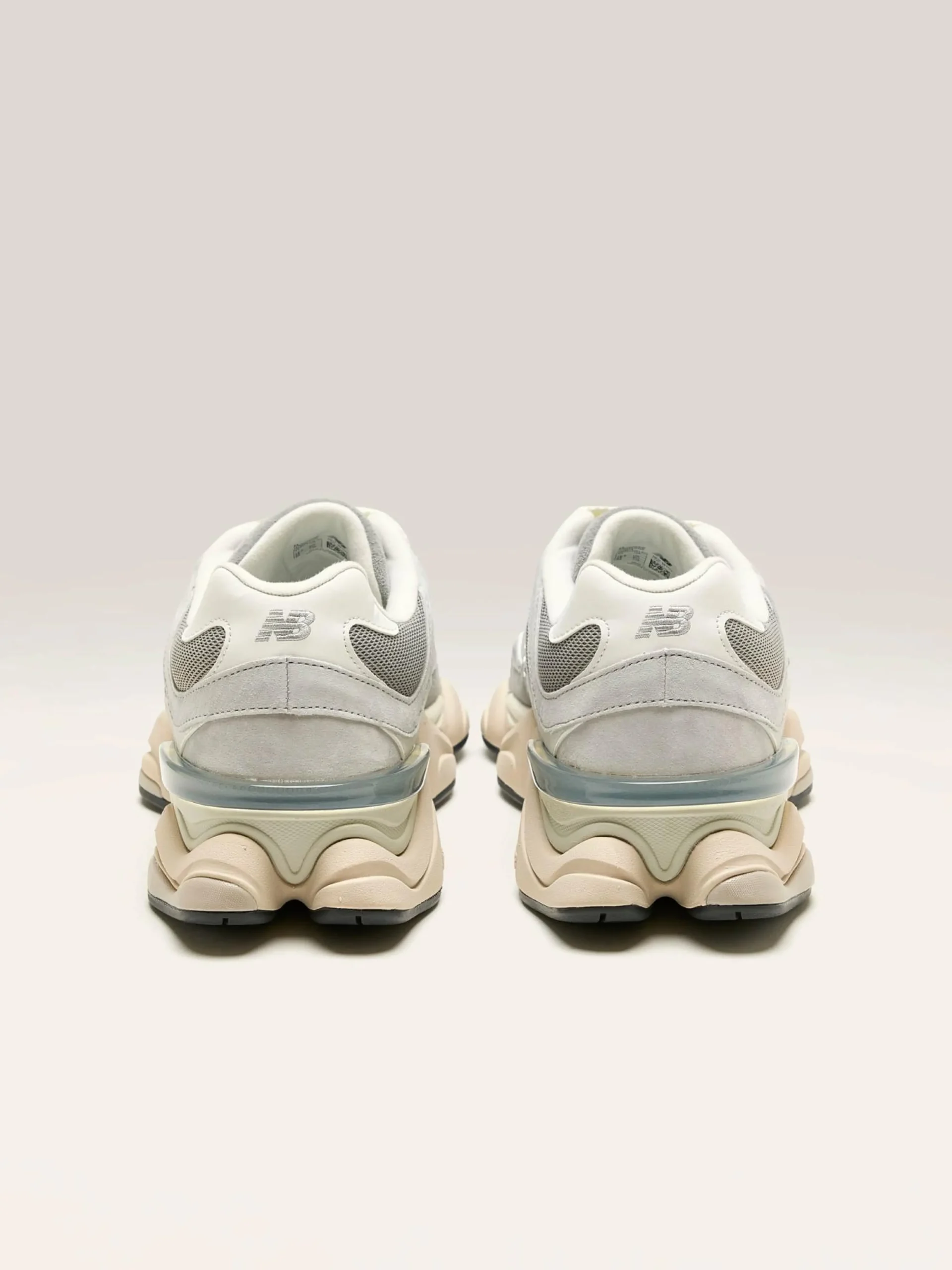 De New Balance 9060 sneakers hebben een technisch bovenwerk van leder, suède en mesh, een dempende middenzool en een buitenzool met een diamanten patroon..