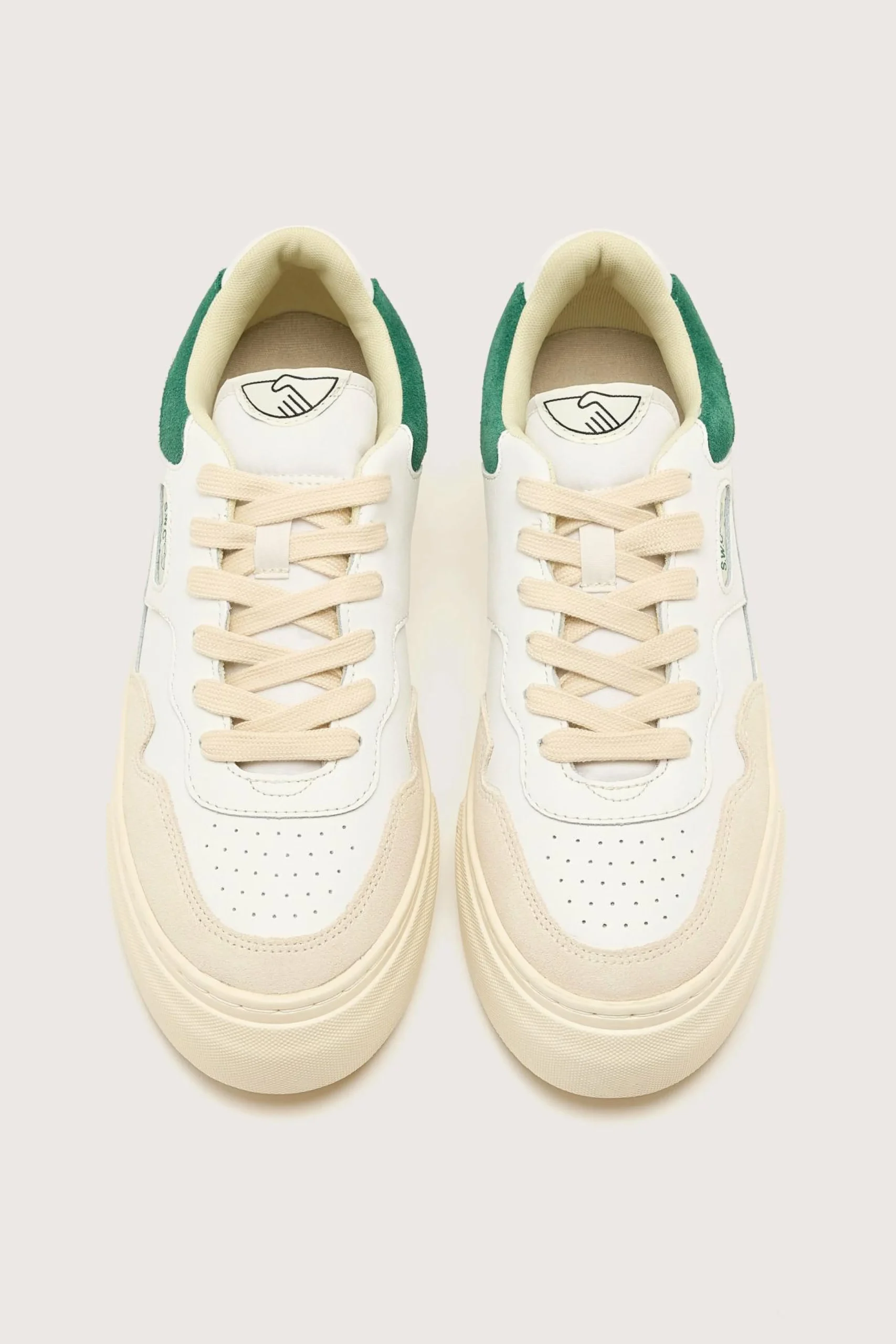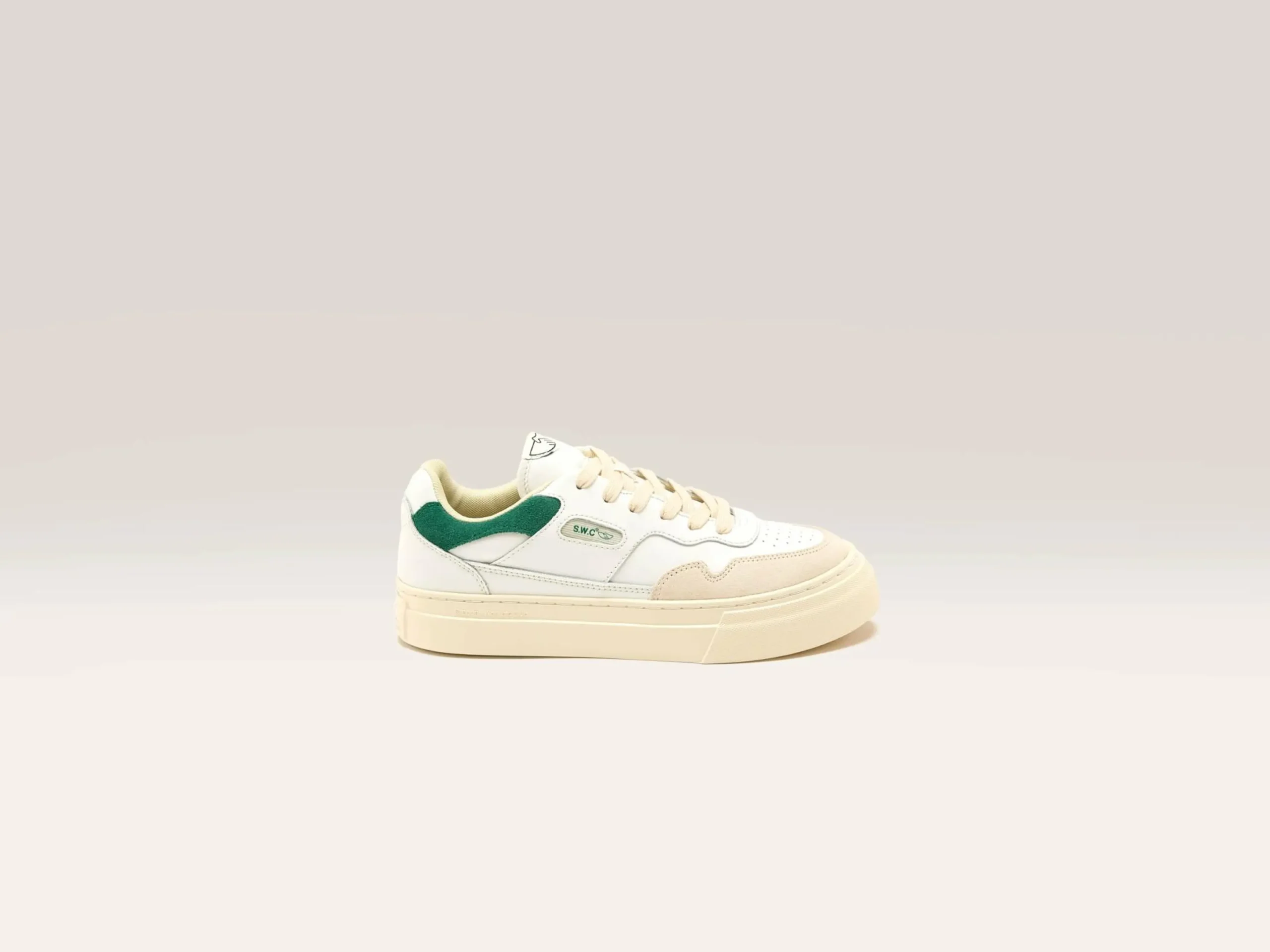 The Stepney Workers Club Pearl Leather sneaker features a leather upper with suede panels on a rubber cupsole.